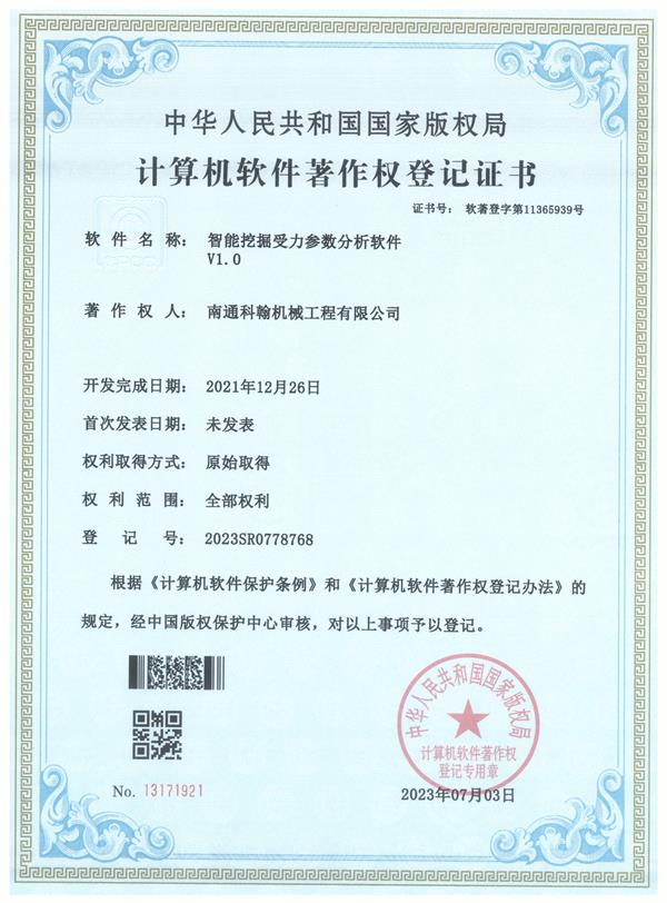 南通科翰機(jī)械工程有限公司 >> 榮譽(yù)資質(zhì) >> 智能挖掘受力參數(shù)分析軟件V1.0