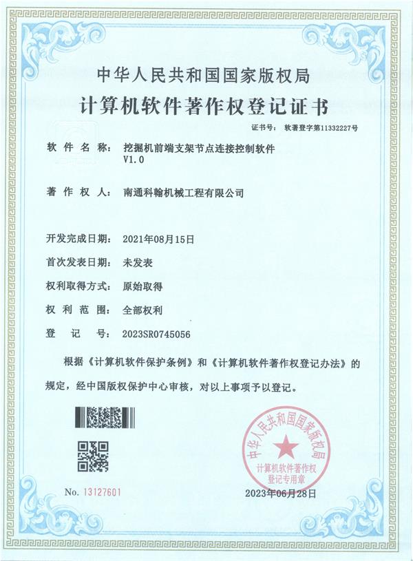 南通科翰機(jī)械工程有限公司 >> 榮譽(yù)資質(zhì) >> 挖掘機(jī)前端支架節(jié)點(diǎn)連接控制軟件V1.0
